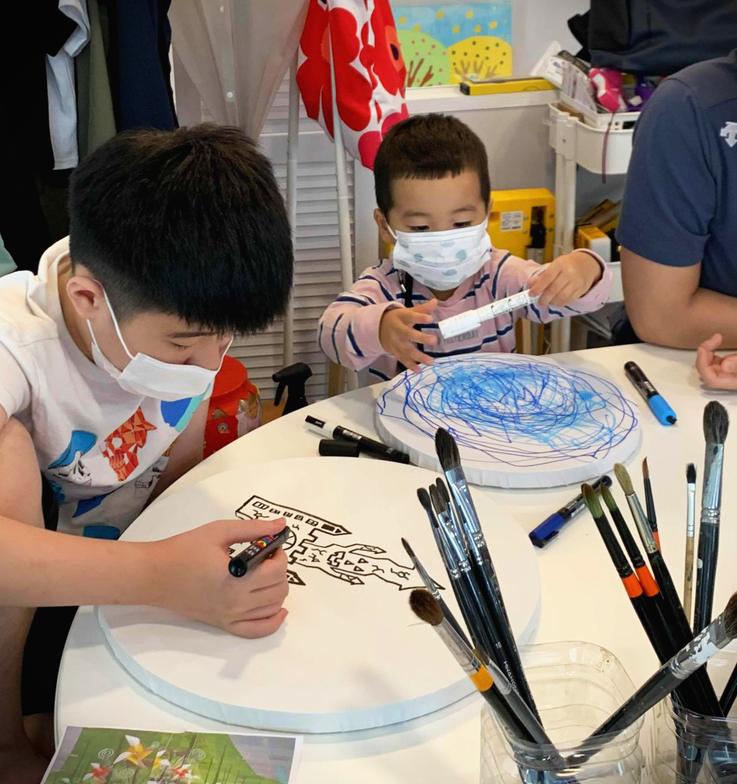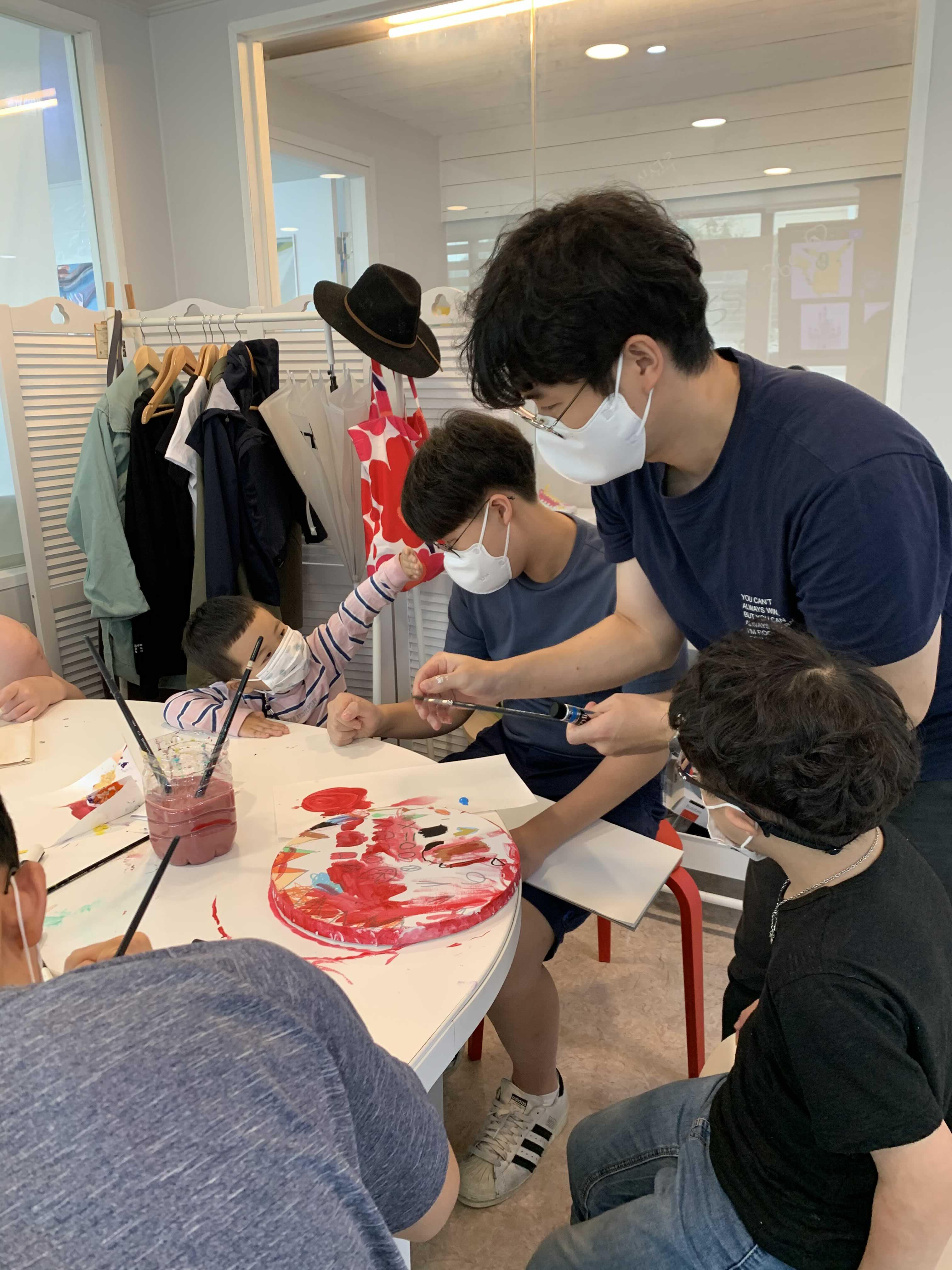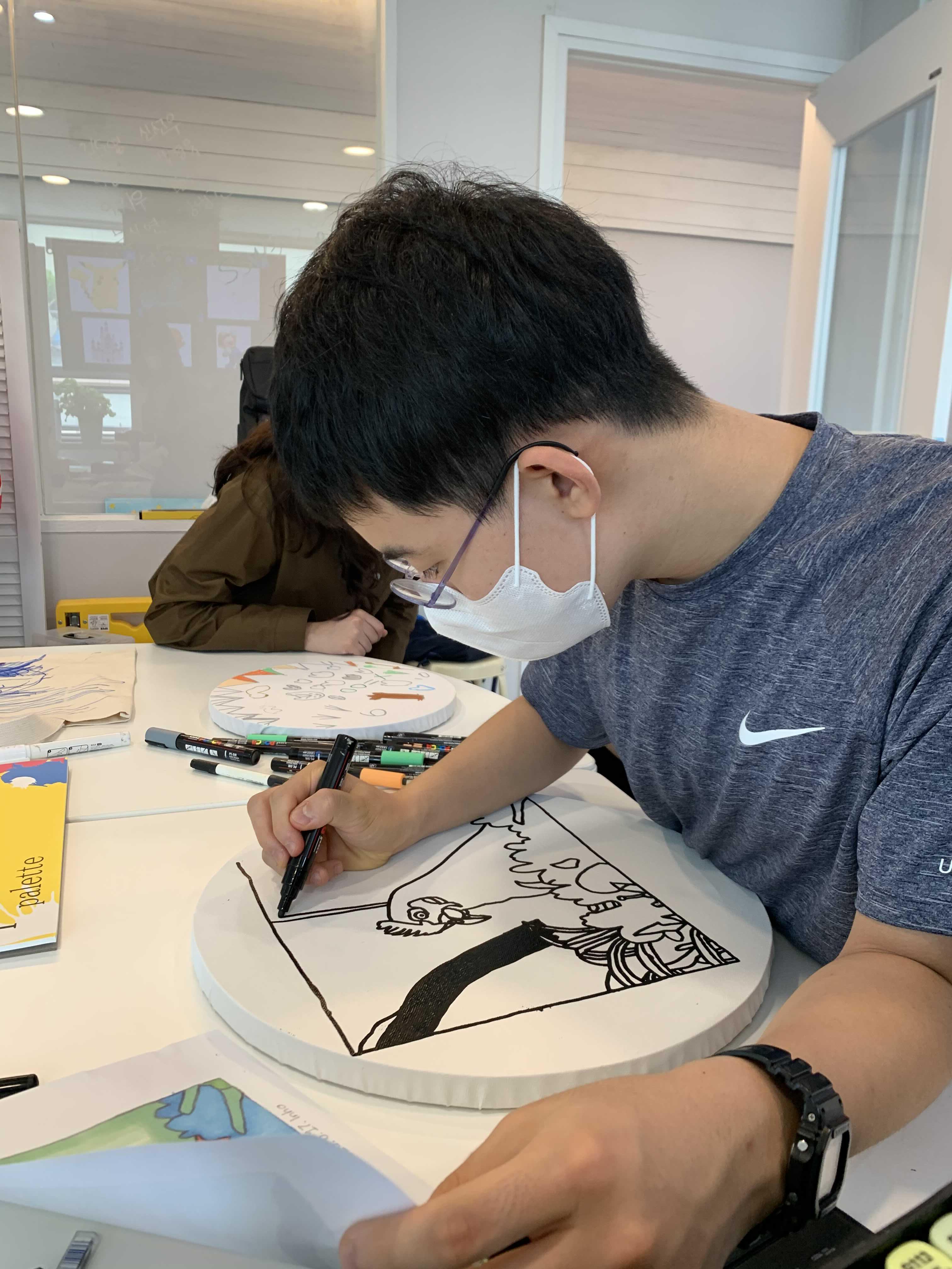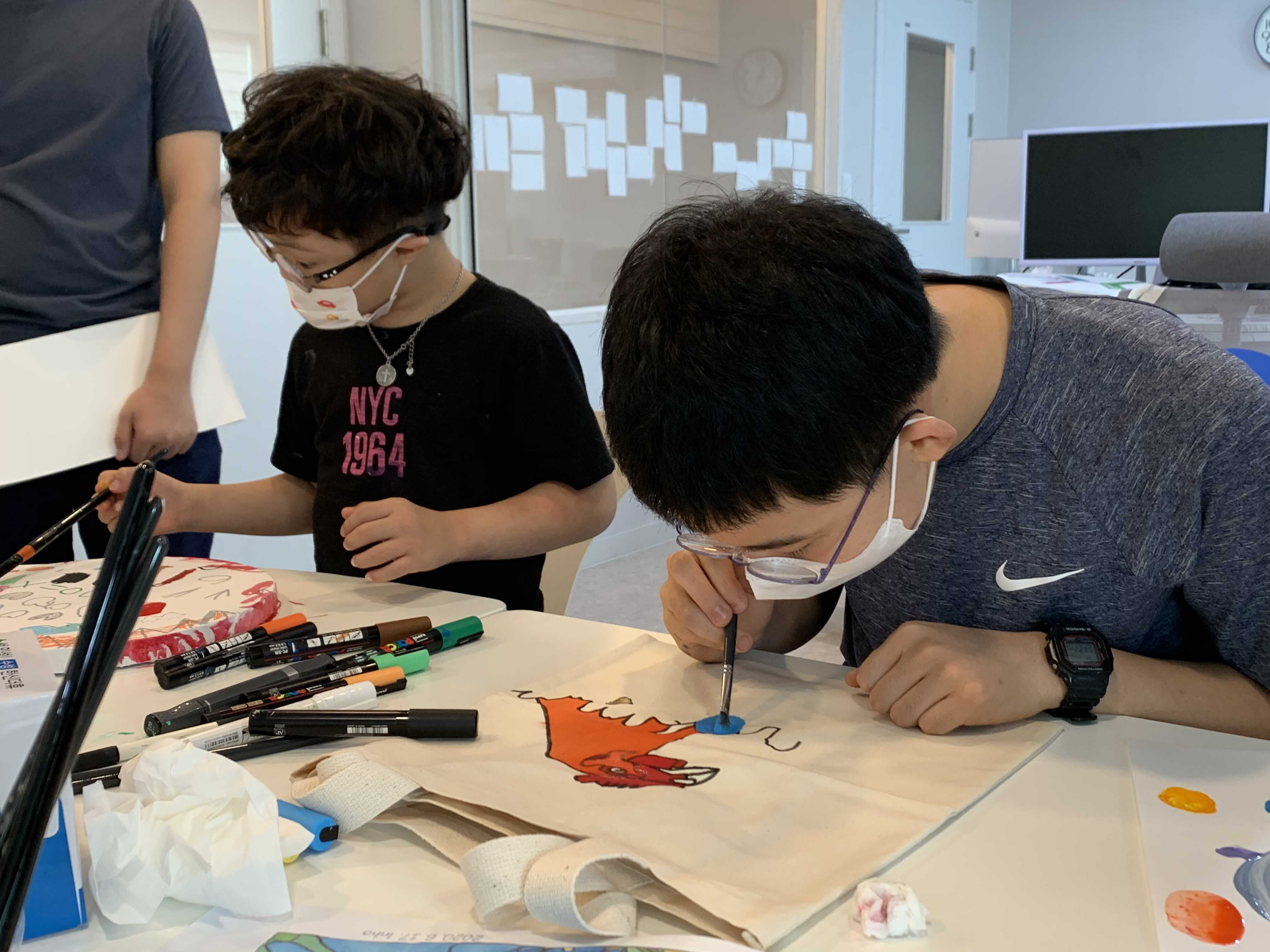 ∨ 가르치고 배우며 쉽게 위계화 될 수 있는 교육의 장이 일방적이지 않은 관계를 통해 서로 자연스럽게 동화되었다. 아크릴물감의 용도와 활용을 자연스럽게 터득해 캔버스와 에코백에 각각 자신의 그림을 그리며 창작활동을 이어갔다.